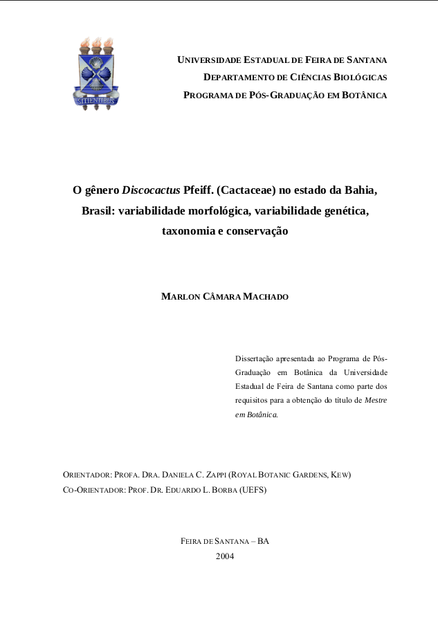 Marlon Câmara Machado. 2004. O gênero Discocactus Pfeiff. (Cactaceae) no estado da Bahia, Brasil: variabilidade morfológica, variabilidade genética, taxonomia e conservação
