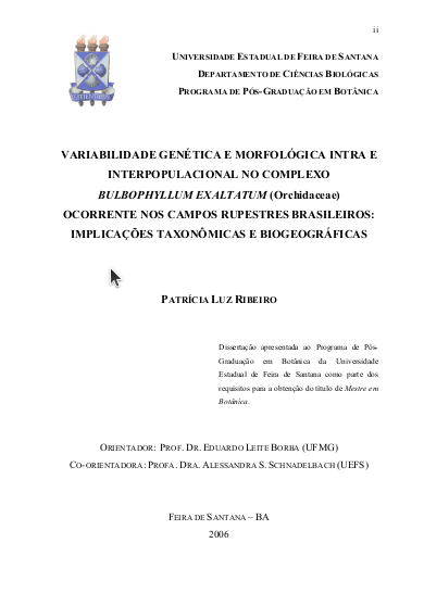 Patrícia Luz Ribeiro. 2006. Variabilidade genética e morfológica intra e interpopulacional no complexo Bulbophyllum exaltatum (Orchidaceae) ocorrente nos campos rupestres brasileiros: implicações taxonômicas e biogeográficas